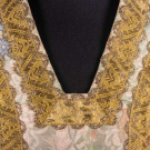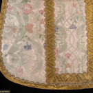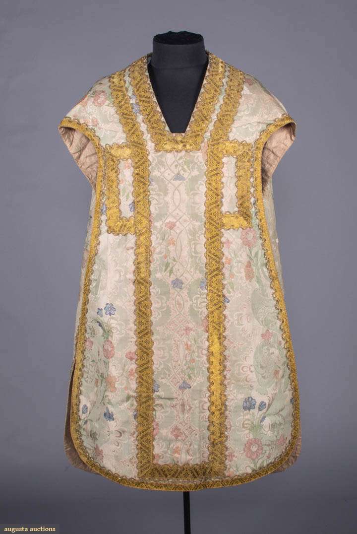 Ornament d'eglise chasuble in patterned damask weave w/ twill broché multi colored florals, waxed linen lining, gold galloon w/ open scalloped edge, European Continental, Wd 15.5"-28", L 41.5", (light stains/discoloration to lining, wear to trim, tiny-3" light stains, tiny-1.25" wear holes CB) excellent.