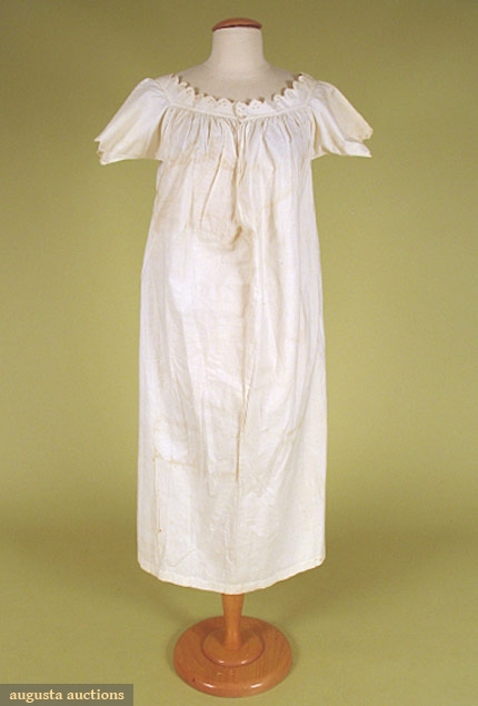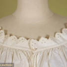 Wide neckline and short capped sleeves trimmed with scallops and eyelets, gathered to shallow yoke, one center front shell button, below knee length, (discolored and small stains) good.
