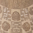 Black & ecru silk lame' evening cloak w/ checkerboard & rows of floral & pseudo oriental motifs, single large cast button & loop closure at throat, broad padded & ruched collar & lining of silk panne velvet, SH-SH 17", L 49", (few tiny-0.5" stains, light discoloration & tarish to right side, tiny pulls, few crush spots, tarnish to seat) excellent.