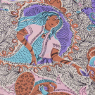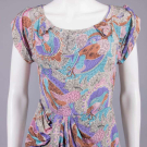 All resisted dyed & printed silk: 1 crepe in flower & ribbon motif w/ self tab jabot & SH fringe, skirt gathered to W yoke, matching belt, label "Styled by Hadley Juniors", B 35", W 25", L 38", (underarm stains, hem wear, seam openings right SS & W); 1 w/ rose & daisy motifs on black ground w/ extended SH cap slvs & crossover black taffeta peplum, B 37.5", W 28", L 44", (1" stain B, 1.5" stain lap, belt missing); 1 w/ djinn motifs in shades of pink, blue & brown w/ fine linear filigree on white ground, scoop neckline w/ self tabs, faux wrap skirt w/ draped & pleated W accent, label "Mildred Kahan Fifth Ave Fashions", B 30", W 24", L 43", (1.75" seam openings to zip & left B dart, minor dye bleed, 7.5" & 5" openings CB) all good-very good.