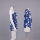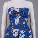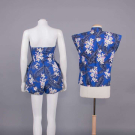 2-pc cotton playsuit printed in orchid & frond motifs on sapphire blue ground c/o miniature strapless romper w/ fold over neckline, puckerette pleated SS, broad open H pockets & CB zip closure, matching coverup w/ Nehru collar, standing SH cap & patch pockets, label "Shaheen's of Honolulu, Made in Hawaii Distinctive Sportswear for Discriminating People" & "Tropic Orchids, Alfred Shaheen Handprint-Hawaii", playsuit B 30.5", unstretched W 24", H 40", L 24", inseam 2", coverup B/W 38", L 23.5", (no SH/halter strap, lining stained at B & seat, 1 broken button on coverup) excellent.