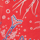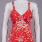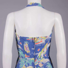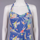 1 resist printed silk halter neck dress w/ vignettes “Aloha Hawaii, Leis & Waikiki Beach” print, bodice lined in cotton, label "Aloha Hawaii", B 33", W 25", L 40", (hem & CF skirt seam altered, tiny-0.75" stains right torso, 2" stain CB hem & 3" right tiny-0.25" holes, seam allowances fraying) good; 1 printed cotton bathing suit w/ white & navy sea creatures, seaweed & bubbles, B 33", W 26", L 26", (few tiny spot stains/pulls, many tiny-0.5" holes in wool lining, light stains at seat) very good.