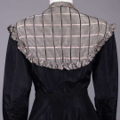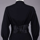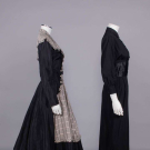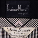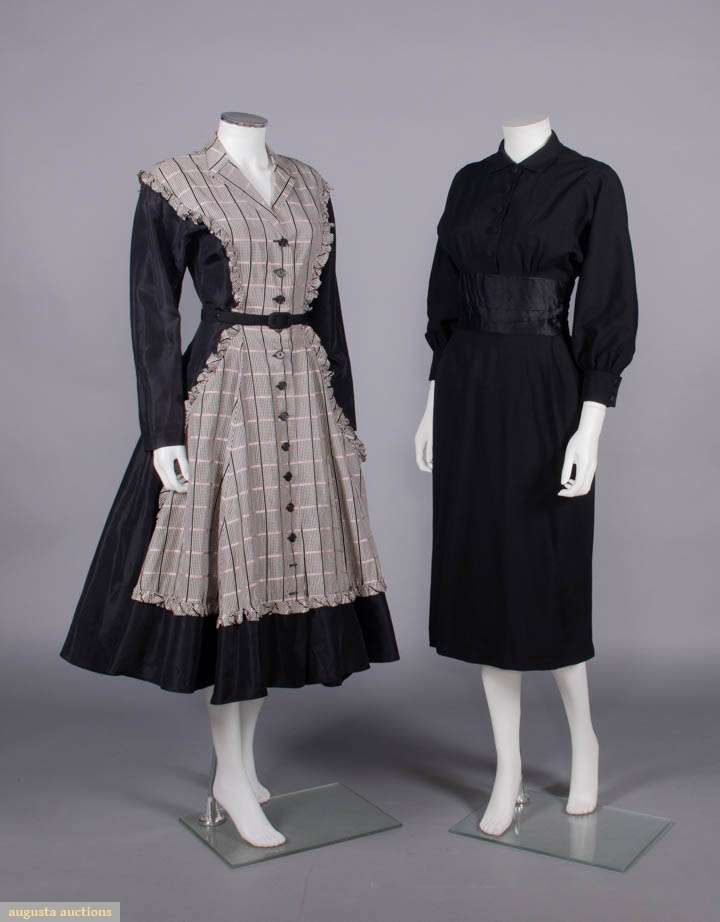 1 black synthetic long sleeve day dress w/ pink & black window check plaid applied apron front w/ self-ruffle edging into back yoke, CF button closures & black fabric covered belt, label "A Jean Desses Original by Raymodes Negliges, Paris, NY", B 36", W 26", L 46", (2" seam opening belt, few light stains, missing botton 2 buttons, 0.25"-1" stains CB skirt, few pinholes) good; 1 black silk day dress w/ silk satin cummerbund W & self-covered CF buttons, label "Traina-Norell New York", B 36", W 26", L 45", (1 pinhole in sash, hem lowered w/ some loose threads) excellent.