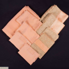 Set of peach silk crepe de chine bedclothes c/o duvet & 4 matching pillowcases all w/ drawn thread work & shadow stitching in classic Deco cartouche motif, all w/ "FV" monogram, 61" x 77", larger pillowcases 39" x 31", smaller pillowcases 26" x 18.5", (stains around duvet opening, few tiny holes & stains, two 11" stains parallel to seams & 1 to large pillowcase) good; set of peach silk satin bedclothes c/o of 2 bed sheets & 2 pillowcases all w/ ecru Chantilly lace borders & insertions, 75" x 90", pillowcases 20.25" x 41", (minor stains to lace, 3.5" x 1.5" stain 1 lace stripe on pillowcase & 0.75" seam opening) very good.
