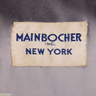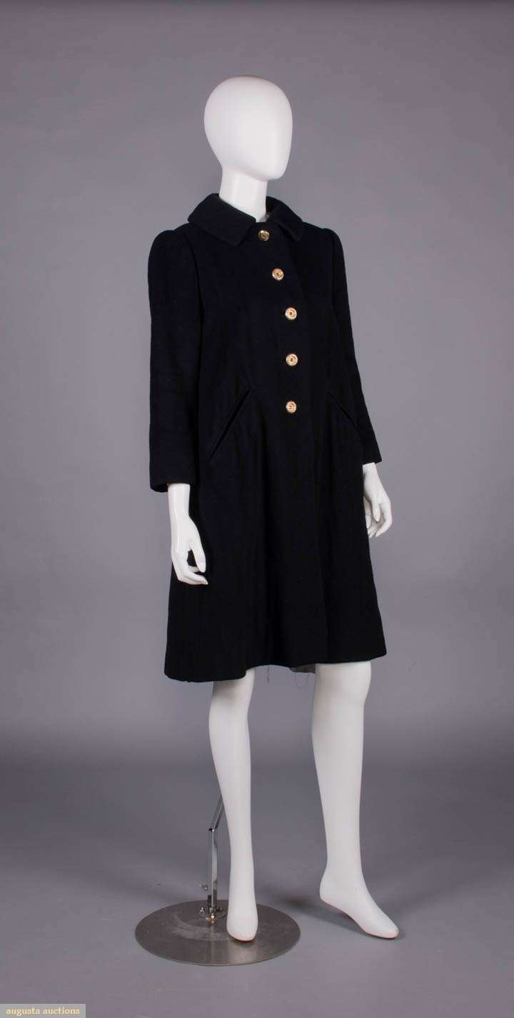 Black diamond quilted cashmere coat w/ gold tone buttons, diagonal slash H pockets, lined in twill satin, label "Mainbocher Inc. New York", B 46", L 40", SH-SH 20", (button plating worn, 11" & 3" seam openings hem lining) excellent.
