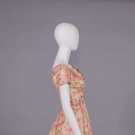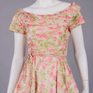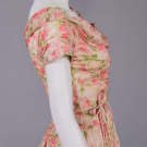 Floral print on white silk shantung ground w/ draped scoop neck, short draped cap sleeves, fitted bodice w/ double spaghetti cord at W, skirt box pleated into W, silk lined, B 34", W 25", L 44", (bodice boning w/ minor warping, 1" shatter CF skirt, 0.5" pull below front W, 0.25" stain front right SH, underarm wear, loose stitches back right collar) excellent.