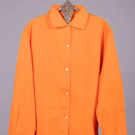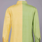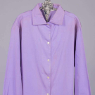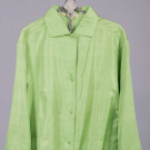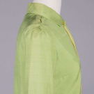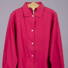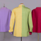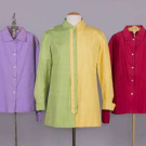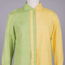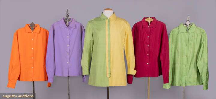 2 w/ label "Emilio Pucci Florence-Italy, 100% Pure Cotton": 1 cranberry c. 1955, B 40", W 37", L 24", (few pulls, bottom button replaced), 1 purple c. 1960, B 39", W 37", L 23", (discoloration, left cuff button missing, stains to collar & cuffs, 2" scuffing front right SH, few pulls); 2 w/ label "Emilio Pucci Florence-Italy, 100% Pure Silk": 1 green, B 40", W 37", L 25", (tiny-0.5" light spot stains), 1 mi parti green & yellow, B 40", W 38", L 30", (2 detached/incl buttons, 1.5" stain left elbow, 3.5" light stain CF W, 3.5" seam opening right SH, 1" stain left SH, tacks undone CF band); 1 orange, label "Emilio S.R.L. Capri-Florence", B 42", W 37", L 23", (light discoloration) all fair-excellent. Museum at FIT.
