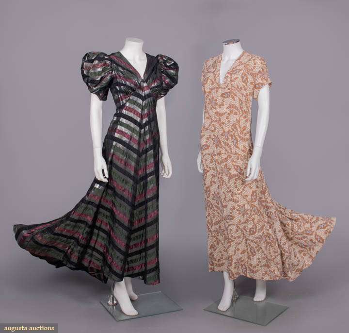 1 silk & lame’ in diagonal mitered stripes of black, green & wine w/ intermittent mottled silver stripes, bodice gathered into V front extending into flared skirt, puff sleeves, key-hole back w/ button closures at SH yoke & down CB, skirt draped into double pleated fall at CB, B 38", W 28", L 53"-60", (0.75" tear left underarm, 0.75" hole CB hem, top CB button very worn w/ loop torn, several missing/loose buttons, 1" & 0.75" tears bottom CB opening, 1.25" opening CB hem, sm holes) very good; 1 resist print rayon w/ white shibori inspired leaf, lily & star motif on coffee brown ground, T shaped short sleeves, form fitted into ankle length skirt, B 36", W 28", L 54"-59", (5" alteration back right W, few tiny-0.25" holes esp at seat) excellent.