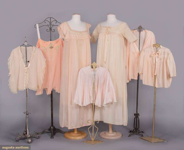 1 silk satin bed jacket w/ striped SHs, label "Precision Made by Eastern Isles", B 44", L 19", (0.75" tear left armscye); 1 peach silk crepe step-in w/ CF ribbon flower, label "The Rike Kumler Co", B 42", L 34", (tide marks, shattering straps); 1 peach china silk bed jacket w/ embroidered daisies, B 54", L 24"; 1 peach silk crepe bed jacket w/ cotton lace inserts, B 40", L 20"; 1 pink silk twill bed cape w/ cotton lace & pale blue appliques, L 16"; 1 pink china silk nightgown w/ fillet, B 38", L 52"; 1 pink silk crepe nightgown w/ crochet yoke, B 36", L 50", (all w/ spot stains, sm holes, pulls/minor fraying & discoloration) all good-excellent.