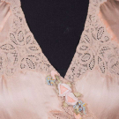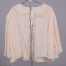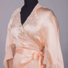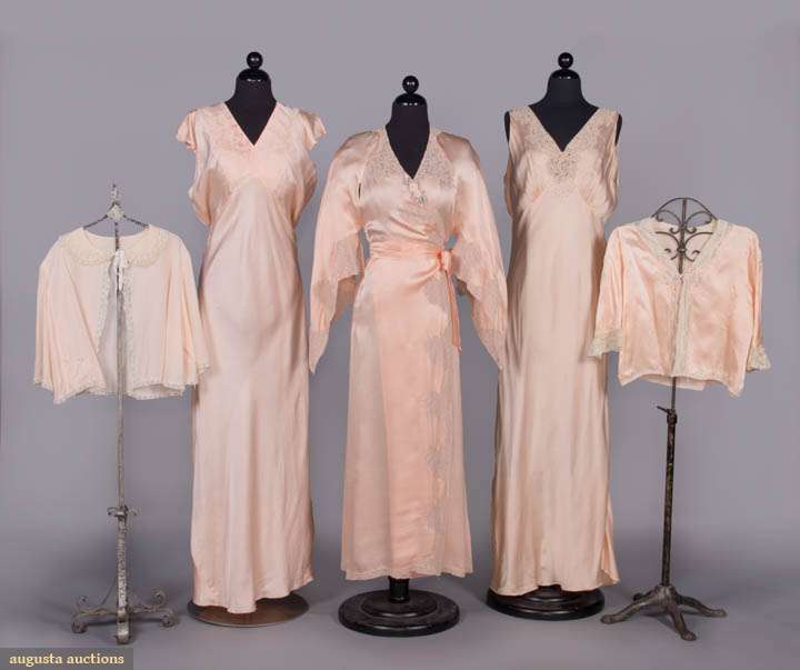 1 crepe bed jacket w/ white cotton Val lace at collar, CF, slvs & hem, B 42”, L 17”, (spot stains, few sm holes); 1 silk satin peach bed jacket w/ cotton lace inserts, cuffs & trim & w/ hand embroidery, B 40”, L 19”; 1 silk satinette nightgown w/ SH ruffles & hand embroidered front panels, B 42”, W 40”, L 58”, (stains to front up to 2.25”); 1 robe w/ raglan bell slvs, ecru mm guipure lace insertions at slv, neckline & down CF, rayon ribbon floral applique at CF neck, B 34”, W 28”, L 51”, (seam openings at armscyes, spot stains right H); 1 silk satin nightgown w/ lace neckline, silk guipure lace inserts & eyelet embroidery, B 38”, W 34”, L 58”, (belt missing), (all w/ minor fraying) all very good-excellent