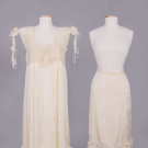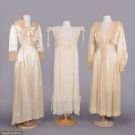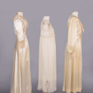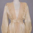 1 crepe back rayon satin robe w/ peach chemical lace gathered collar & deep cuffs, self bow at CF neckline, CF W buttons, B 36”, W 24”, L 55”, (pulls, 0.75” seam opening left armscye & 1.25” right, discoloration) good; 2-pc slip set ℅ cream em silk crepe nightgown w/ cotton fillet lace inserts & schiffli embroidered net panels & 1 half-slip w/ fillet lace trim, B 36”, W 40”, L 48”, slip W 45”, L 31” (wear/fraying to trim, light discoloration elastic shot) both very good; 1 pale yello satin robe w/ beige mm lace over SHs & down CF, slight balloon sleeves, label “Tula”, B 40”, W 28”, L 54”, (slip N/I, hem altered unevenly, light staining, many tiny-0.5" tears at back neckline) good.