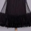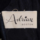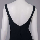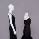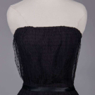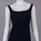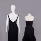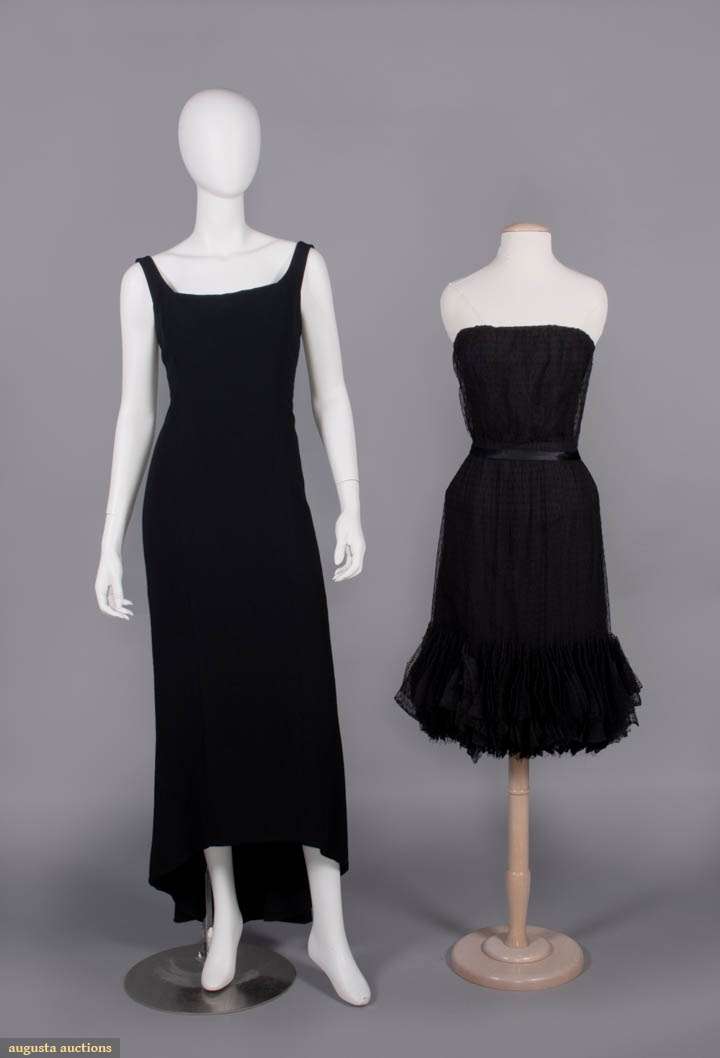 1 wool crepe sheath w/ high-low hem, SH strap scoop neck to deep back, lined in black china silk, label “Adrian Boston”, B 36", W 28", L 50"-60", (few pulls, few tiny holes CB hem); 1 strapless black evening dress w/ boned bodice w/ overlayer of gathered & draped black dotted swiss tulle, silk satin overlaid narrow W band, overskirt w/ napkin folded points in deep hem ruff, lining of black china silk, unlabeled Trigere, B 29", W 23", L 36", (loose stitches b/t inner bodice & dress, 0.75" tear in net CB, hem fraying) both excellent. Ohio State Historical Costumes & Textiles Collection.