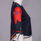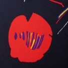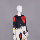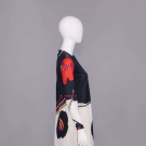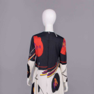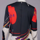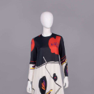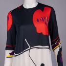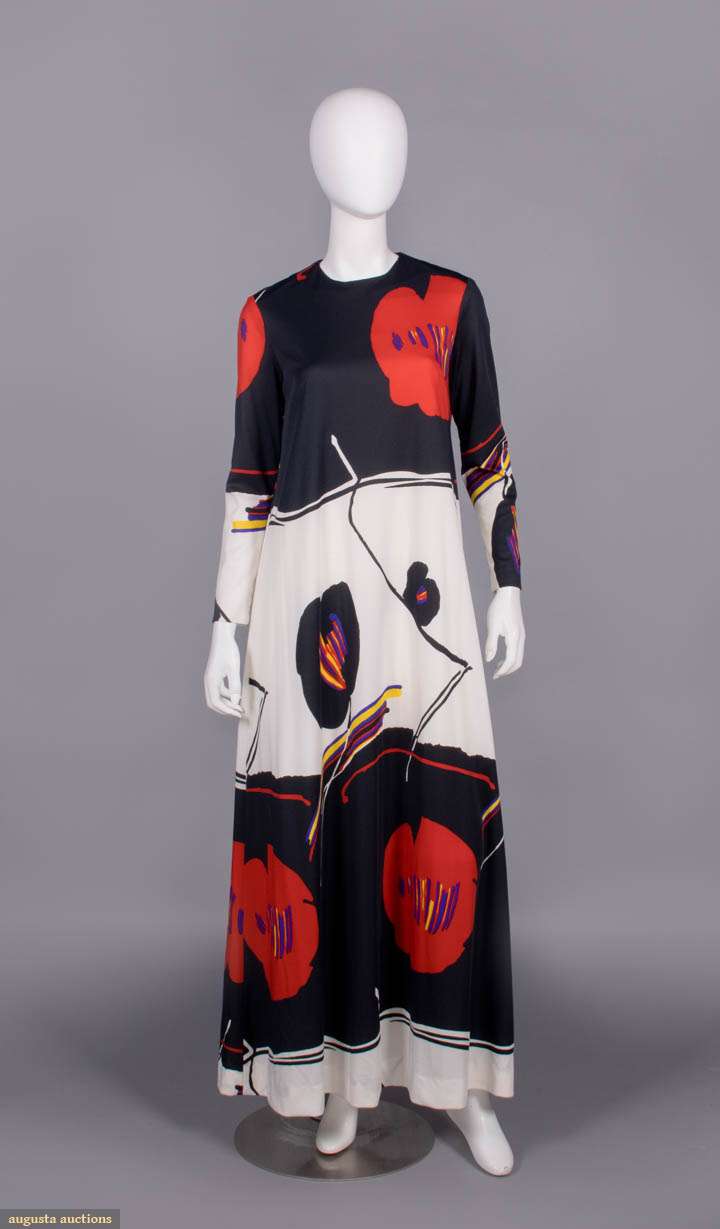 Long sleeve black & cream silk jersey printed w/ black & red oversized stylized poppy motif, CB zip closure, label “Leo Narducci Ambiance”, B 38”, W 40”, L 58”, (some loose stitching inside hem, few light stains up to 0.5” at hem) excellent.