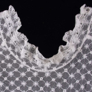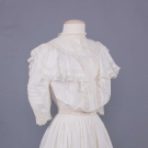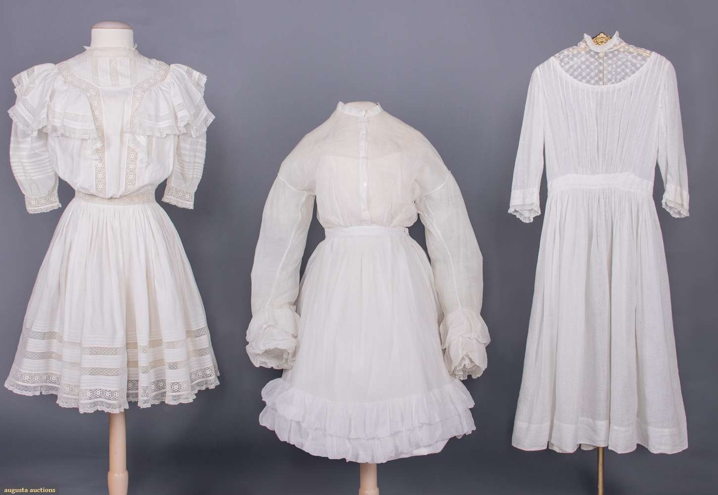 1 white w/ mm lace & Schiffli embroidered insertions, MOP buttons, CH 51", W 23", L 36", (red stains near buttonholes, 0.5" repair above hem, small holes, 1 button replaced); 2-pc white cotton mull dress w/ puff cuffs, late 1860s, bodice B 43", W 25.5", L 14.5", skirt W 24.75", L 23.5"-27", (light stains, 0.5" V cut W, spot stains/small holes, 6" repair seat, missing underskirt); 1 white dotted Swiss cotton dress w/ embroidered net yoke, watch pocket at W, MOP buttons, CH 34", W 22", L 41.5", (missing threads for for pattern, visible stitch lines, 0.5" CH, tiny-0.25" holes & stains, 2 replaced buttons) all good.