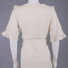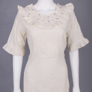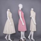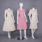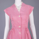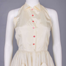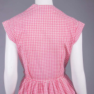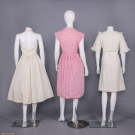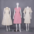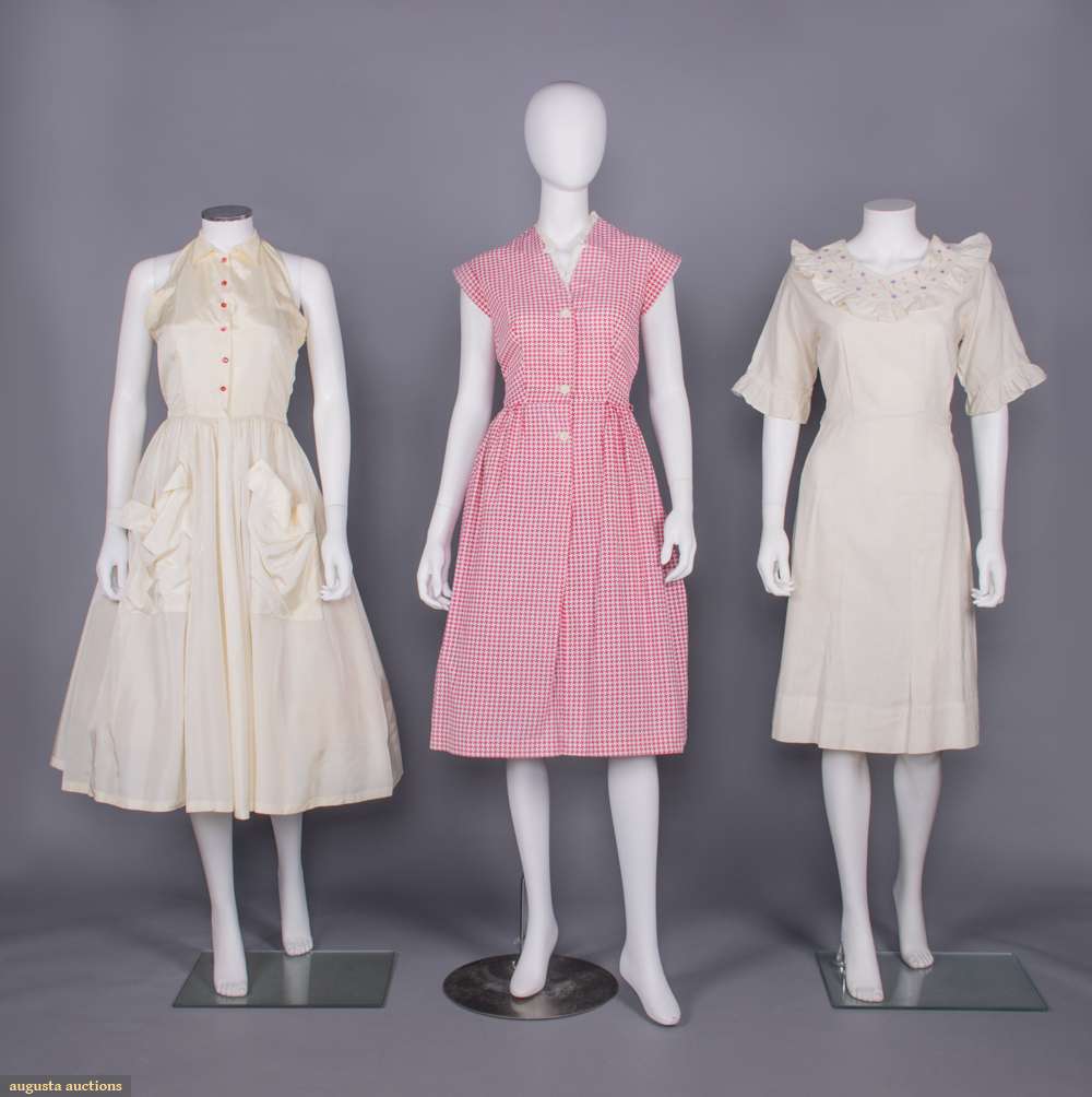 1 rayon halter dress w/ shirt collar, red CF buttons & oversized draped pockets to front full gathered skirt, B 34", W 25", L 45.5", (CF snaps detached w/ green oxidization stains, 3.5" x 0.5" light stain above hem) very good; 1 pink & white cotton printed houndstooth house dress w/ cap sleeves, fitted bodice w/ CF white button closures, label "Brilkie London W.I.", B 41", W 30", L 43", (small cracks in buttons w/ 2 missing, belt missing, fraying at lapel, collar & cuffs, tiny spot stains, sm seam openings armscyes) good; 1 white cotton dress, hand embroidered yoke w/ attached ruffle, B 38", W 33", L 41", (light discoloration, tiny-0.5" spot stains, belt missing, 0.25" hole seat, minor seam fraying) good.