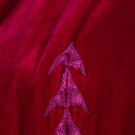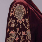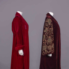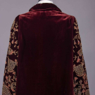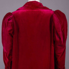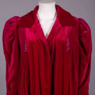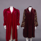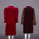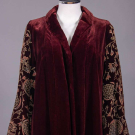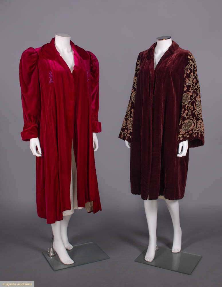 1 magenta silk velvet evening coat embroidered w/ purple embroidered arrowhead motif, square collar, long slvs w/ turn back cuff, champagne satin lining, c. 1928, SH-SH 15”, L 46”, (slip N/I, light crushing & small wear spots, few tiny holes & stains, minor seam strain below arrow stitching, missing closures CF & cuffs, discoloration at hem & lower CB, lining shattered at collar, velvet shedding) good; 1 maroon velvet coat w/ metallic pink, yellow & grey flocking in pineapple motif to long bell slvs, turn-back collar into rolled rever, silk satin lining, c. 1930, SH-SH 14”, L 42”, (slip N/I, crushing/few tiny holes at collar, light wear to velvet, minor cracking to flocking) very good. Deaccessioned by the Valentine Museum.