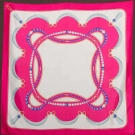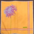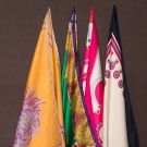 All silk twill & signed w/ designers' name: 1 Gianni Versace emerald green ground filled w/ jeweled crosses & elaborate border of domes in gold, purple & red, 33.5" x 34.5", excellent; 1 Cartier white w/ hot pink borders entwined w/ pearl beads, diamonds & lapis beads, 32.5" 33.5"; 1 Christian Dior mustard silk, in upper right corner is a huge light blue & magenta crysanthemum, 29" x 30", (few stains); 1 Gucci white silk, edged w/ row of cockade blue & red ribbons, all very good-excellent.