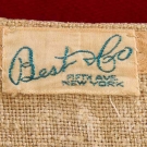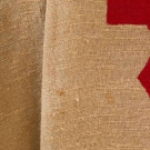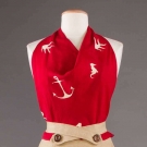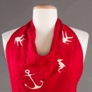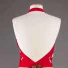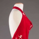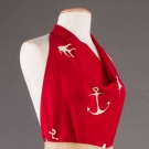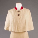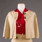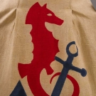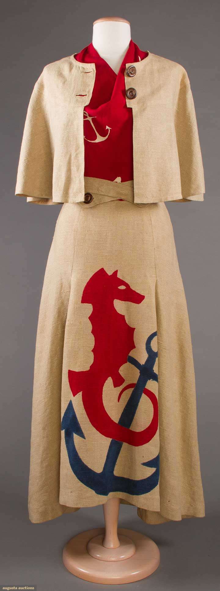 4-piece: cape, belt & skirt of heavy tan linen, red cotton halter top: stencilled blue anchor & red sea horse on skirt, hem shorter in F, pair large brown buttons at F & B waist, short cape w/ 2 buttons, resist dyed white anchors & fish on halter w/ 2 pair button holes to attach to skirt & belt, Skirt W 31", L 33"-39", (few stains) excellent.