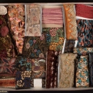 19 deadstock embroidered ribbons, WD 0.5"- 6.5", L 18"- 8+ yards, 1 peach w/ "V" motif 2.25" x 8 yrds, 1 grey net w/ lame swirls, 2" x 2.25 yards, navy w/ peach leaves, 4" x 7 yrds & 1 deadstock 1920s headband w/ metallic threads, "Made in France", WD 2"-5", L 19.5", all good- excellent.