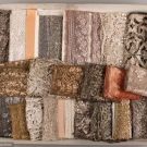20 lengths of deadstock lame lace yardage, flounces & inserts ranging from WD 0.5"- 10.5", L 11"- 32 yrds: 1 pale silver wide lace WD 9", L 4+ yrds; 1 wide black net w/ silver, WD 11", L 33"; 1 orange & gold w/ triangle motif, WD 4", L 42", good - excellent.