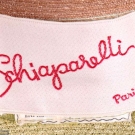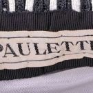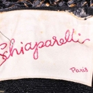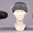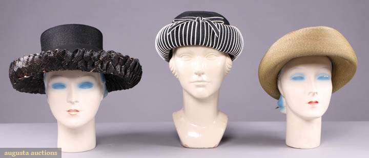 1 celedon deep, elongated turn back brim w/ seafoam green band & natural straw crown, green grosgrain ribbon band, label "Schiaparelli, Paris", circumference 21", L 14", Wd 10", height 6", size 6.75, (discoloration to seafoam band), very good;1 of double layered black & tan braided straw w/ turned up brim & black crown, labels "Schiaparelli, Paris" & "Made in Italy", circumference 20.75", L 14", Wd 14", height 6", (fraying to straw, label attached glued, squished) fair; 1 black & white straw w/ pudding hat brim & CF bow, label "Paulette", circumference 21.25", L 9", Wd 9", height 5", (slightly misshapen) very good.