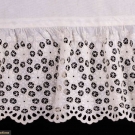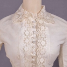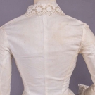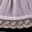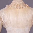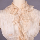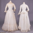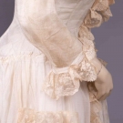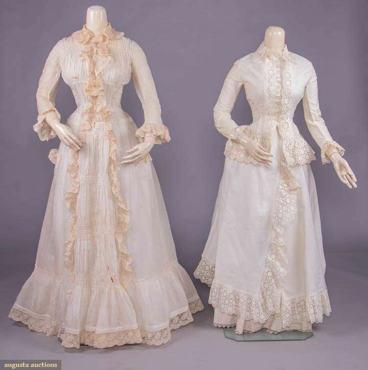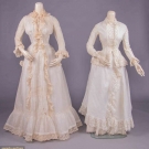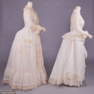 1 cotton organdy at home gown w/ horizontally ruched bodice gathered into corselet style W extending over Hs to gathered skirt ruffle at bustle & flounce edged w/ cotton lace, double collar of lace continuing down either side of CF & expanding at W to double ruffle at either side of pleated & ruched front panel, full length shaped sleeves edged in lace ruffle, B 38", W 23", L 57", (discoloration & spot stains throughout); 2-pc ivory ribbed cotton walking ensemble w/ fitted bodice trimmed in Heilmann embroidered lace in pinwheel floral broderie anglaise design, asymmetrical cross over front skirt w/ gathered ruffle, B 32", W 22", L 21.5", skirt W 22.5", L 37"-45", (discoloration throughout, no skirt closures & spot stains) both fair. MCNY