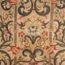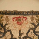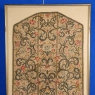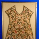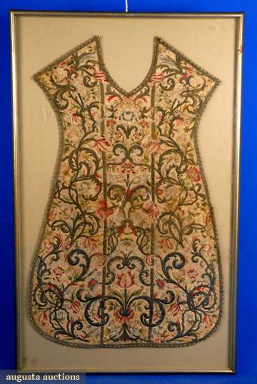 Front & back panels from the same chasuble individually framed, chasuble worked predominantly in red, silver, yellow & gold w/ metallic & silk embroidery in floral & vinework pattern, chasuble 24" x 43", frames 30" x 49", good.