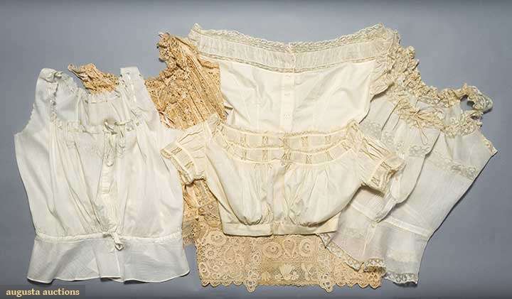 All w/ Val. lace or embroidery: 2 c. 1870s w/ ruched necklines; 3 c. 1905 w/ peplums & 1 early 1920s of Irish crochet, 1 w/ brown foxing, fair & 5 excellent.