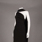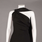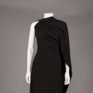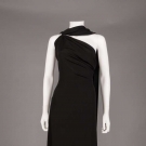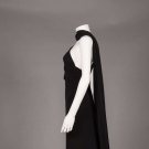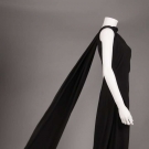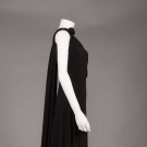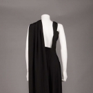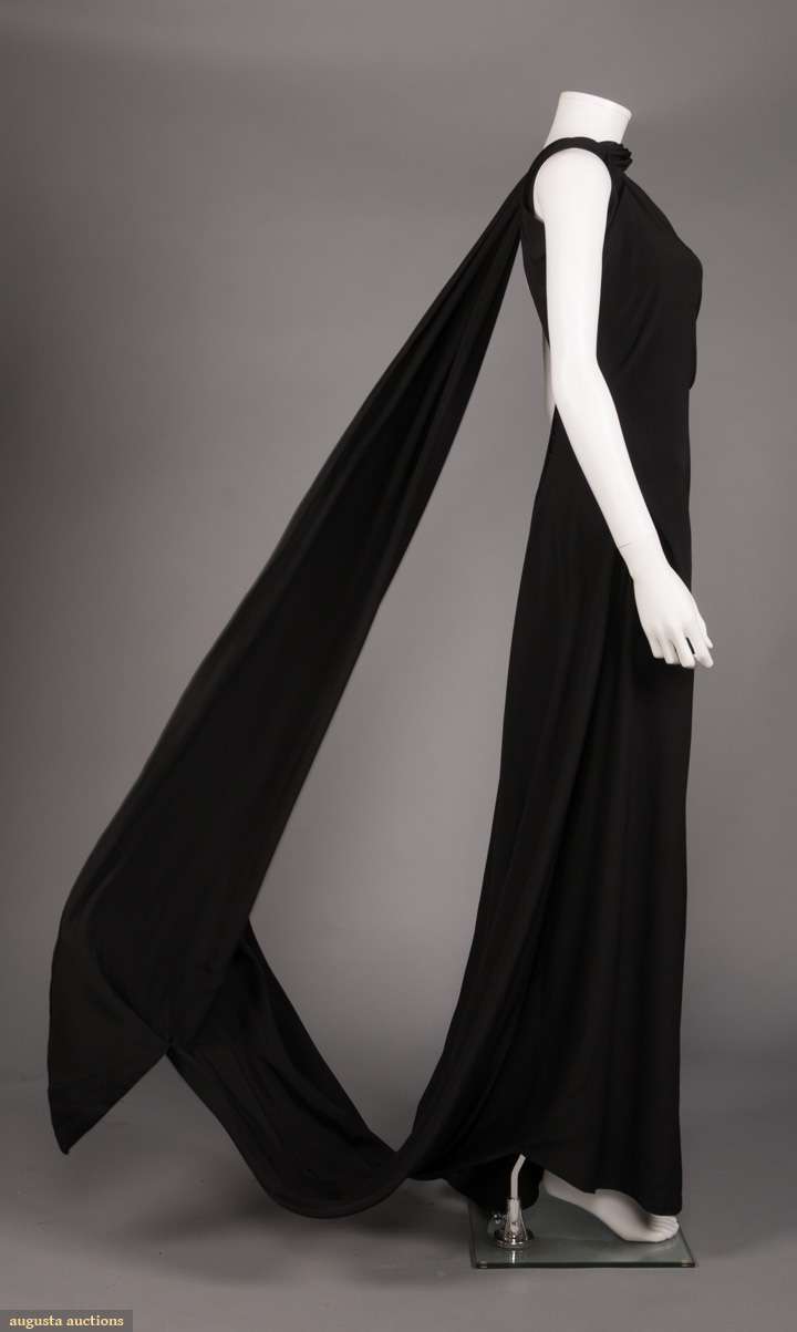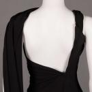 Unlabeled black silk crepe bias cut evening gown AW 1936 w/ mobius panel encirlcing right shoulder across neckline & over left shoulder to hem, side decollete to plunging V-back, couture construction, Madeleine Vionnet, B 36", W 26", H 34" L 59-64", excellent.