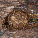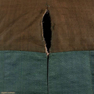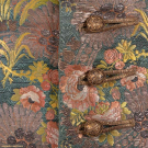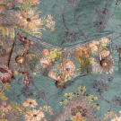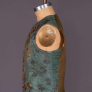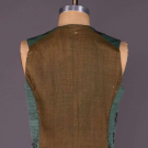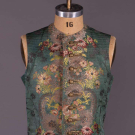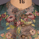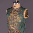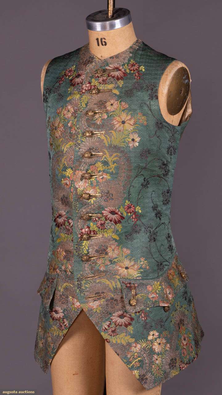 Mans waistcoat woven tisse en form of brocaded multicolored silk w/ floral garland motif twined around metallic lace pattered undulating column on teal patterned silk ground, foil covered domed buttons w/ metallic tinsel & stitched cord overlay, lined in fine glazed tabby wool & linen, 12.75’’ pattern repeat, France or England, CH 35", W 32", L 29.5"-31", (light discoloration & many holes to lining w/ a few being stabilized or repaired, tiny-0.25" holes across back panel, 4.5” stabilized tear at CB above tails, light wear to button holes, wear to metallic threads) very good- excellent. Provenance: Dorothy Quincy Homestead. The Costume Collection of the National Society for the Colonial Dames of America.