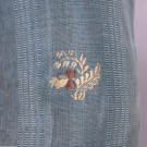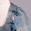 Slate blue silk brocade pair of stays, woven w/ small upright flower sprays of brown silk pansy, cream bluebells & foliate motif. detachable elbow length shaped sleeves tied w/ four blue silk ribbons, tabbed at lower edge, fully lined in linen w/ baleen boning, Italian or French, 1780-1790, B 29.5”, L 19.5”, (front laces N/I, 0.25” holes in silk CF placket, light wear to underarms w/ tiny-0.5” wear spots/hole along edge, wear to silk on lower tabs w/ tiny-0.25” holes, moderate wear CB tabs w/ few holes up to 0.75”, light 1” stain CF, shatter to SLV ribbons, minor discoloration & wear, few pin-tiny holes & stains) very good. Provenance: ex-collection of Pegaret Anthony, who acquired them from the estate of Mariano Fortuny.