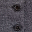 Grey wool boucle skirt suit, jacket w/ double breasted closures of metal spring rondel buttons, unraveled self fringe trim at jacket & skirt hems, jacket, label “Eisa” (Cristobal Balenciaga), B 37” L 17.5-19.5”, (second RT button loose with last LF removed, discoloration to lining at armpit, 6” seam openings on lining on either side, 0.5” seam opening on lining below RT armpit) skirt W 30” L 24.5-29”, (fringe trim detached from hem) Very Good.