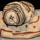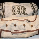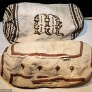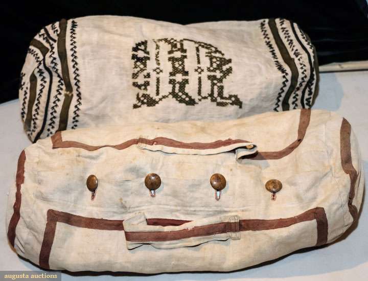 Ecru linen duffles: 1 w/ olive embroidery & trim; 1 w/ brown trim, very good.