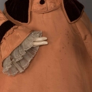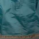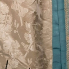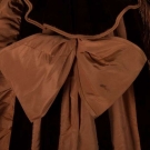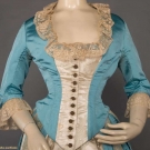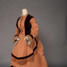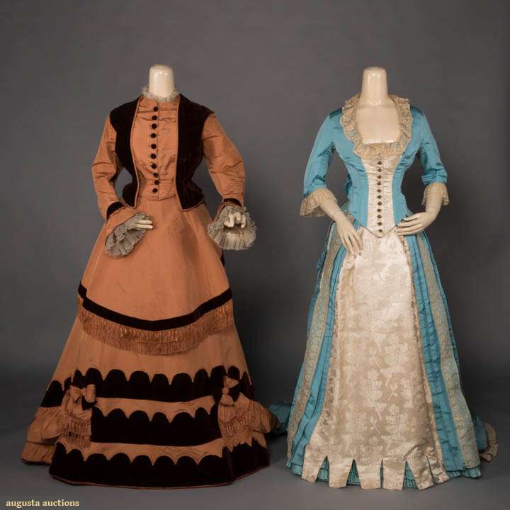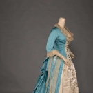 2-pc turquoise blue silk faille & cream brocade gown, trimmed w/ cream lace, c. 1887-1888, B 32", W 22.5", L 22", Skirt L 41"- 55", (bow detached, underarms worn, tide marks to hem, few tiny-small stains to skirt CF hem, seam separating at W); 3-pc visiting gown in raw sienna silk taffeta & chocolate silk velvet w/ silk trim & ruffle at cuff & high collar, c. 1875, B 33", W 20", L 18", Skrt L 44"-58" (4.5"x5.5" seam separation to underskirt, bodice lining damaged, stains to skirts) both fair. MCNY.