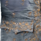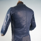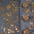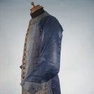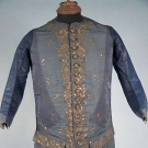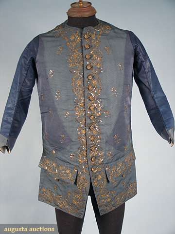 Slate blue horizontally ribbed silk embroidered in metallic gold, shaped gold paillettes & sequins, 20 CF buttons & 3 under each pocket, blue calmanco back & sleeves, blue silk cuffs, ivory silk lining, Sh-Sh 15.25", Ch 42", L 32.5", (identically shaped fade marks on both sides of garment, if not for fading excellent) fair.