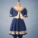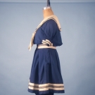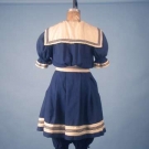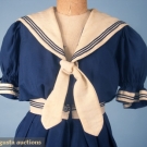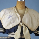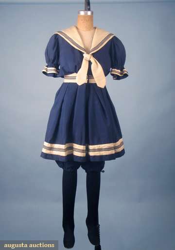 Marine blue lightweight wool, white sailor collar & trim, button-on skirt, labeled "Arnold Constable & Co. New York", B 34", W 25", L 40"; 1 pair black cotton knit thigh-high canvas sole bathing shoes & set of "Aybad's Water Wings Patented May 7, 1901", excellent.