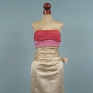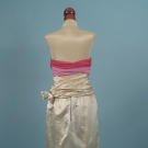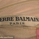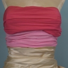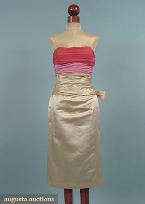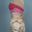 Cream silk satin w/ rose & hot pink chiffon bands on bodice, B 30", W 22", center front L 33", label "Balmain Paris", original owner Nina Dyer wife of Baron Thysnen Bornamisa, (hem shortened) excellent.