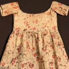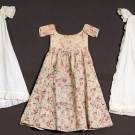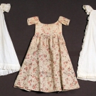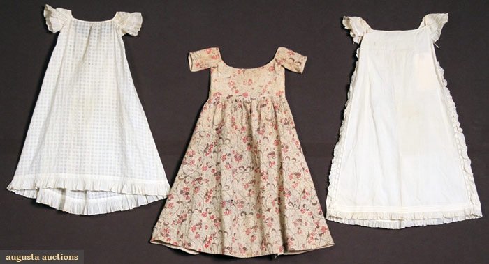 All cotton w/ draw-string backs: 1 Rare infant dress of early printed cotton, poor; 2 white dresses w/ ruffles & double draw-string back, very good; t/w 1 lady's linen shift, 18th C, fair.
