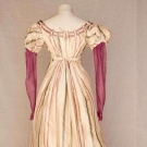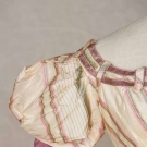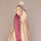 Cream ground w/ pink & ombre green stripes, short puff sleeve, tabbed neckline trimmed w/ purple satin bands, magenta wool undersleeves & three bias self fabric bands at hem, B 30", Hi W 23", L 52", (wool sleeves damaged) other than removable wool sleeves, excellent.
