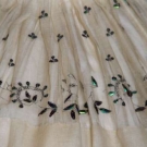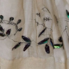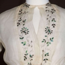 White organdy blouse & tiered skirt, embroidered w/ irridescent emerald green to cobalt blue beetle wings forming floral pattern w/ silver metallic vines, B 36", W 28", Skirt L 43", (CF buttons & sash missing); includes extra yardage w/ same technique,different beetle wing pattern; t/w 1 1930s blouse made from 1860s organdy fabric, attached rayon slip; very good. BROOKLYN MUSEUM