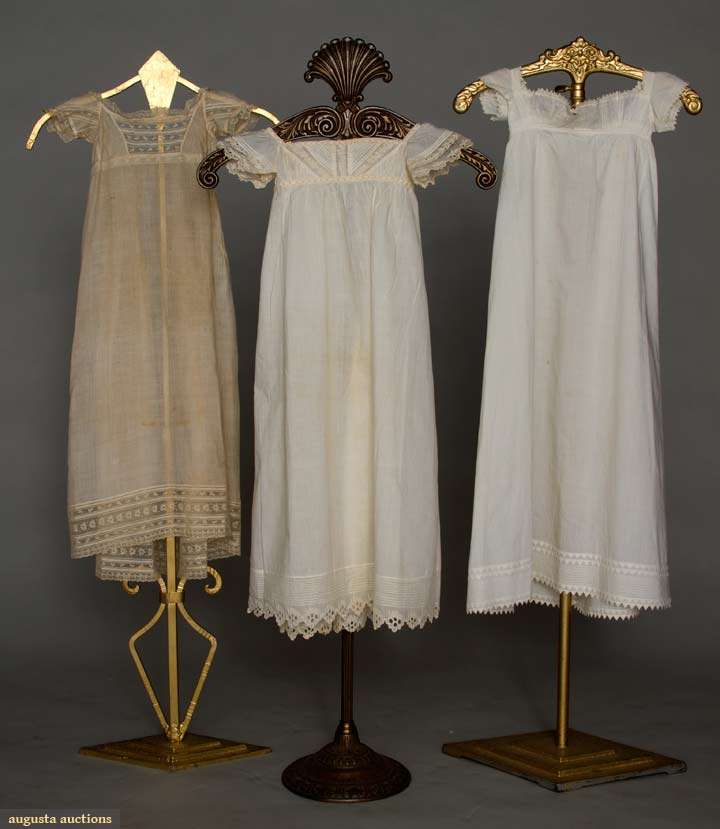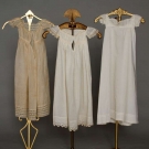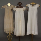 All white w/ very short sleeves & empire waist: 2 w/ lace &/or whitework embroidery; 1 w/ pintuck bodice & Van Dyke points, CB open; fair-excellent. Brooklyn Museum