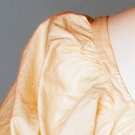 Cotton muslin, gathered & tied neckline F & B, CB tie, long sleeves, deep hem band w/ star flower & stylized scroll embroidery, B 32", L 52", (small brown stains, front neckline worn & repaired) very good.