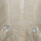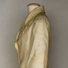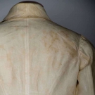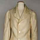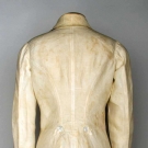 White linen, single breasted, cut-away front, CB pleat on coat skirt, horizontal back seam, (dirty) excellent.