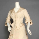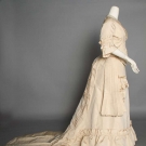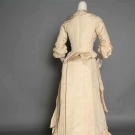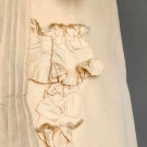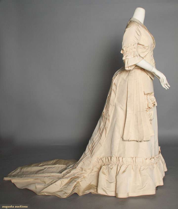 2-piece faille, elbow length sleeves, trained skirt w/ deep hem ruffle, knife-pleated sashes, self fabric "wedding pocket", skirt lined w/ buckram, B 34", W 22", Skirt L 39"- 69", (hem edges soiled) excellent.