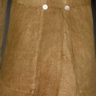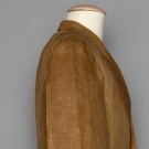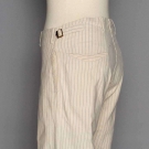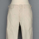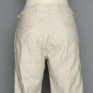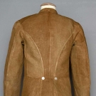 Brown, single patch pocket on left breast, rounded notched collar, 2 button closure, horizontal waist seam, back vent w/ 2 hidden pockets inside, mother of pearl buttons, Ch 34", L 31", (uneven color, large water stains on right skirt panel) very good; t/w 1 pair c. 1900 white cotton & blue pinstripe trousers, excellent.