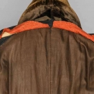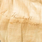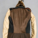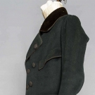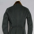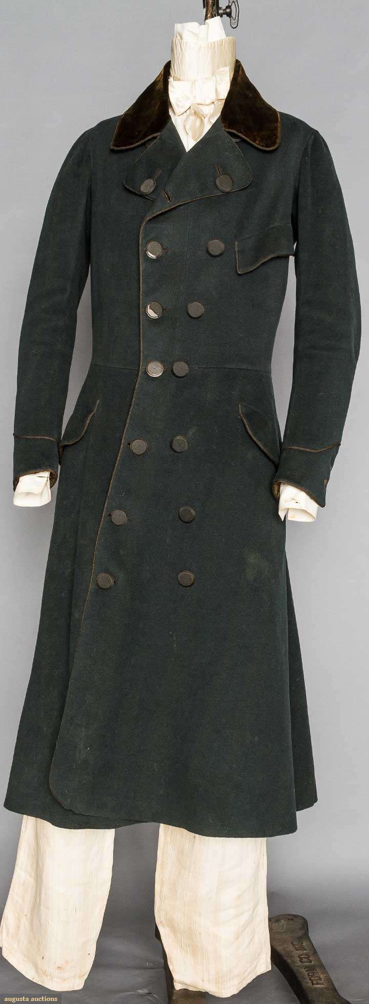 Wool broadcloth, fitted, 7 pair buttons in hour glass pattern, 1 chest & 2 side pocket flaps, top-gathered narrow sleeves, long 3 button cuffs, half rever collar brown velvet, gold braid pocket, cuff & collar edging, W seams in F & sides, full B skirts, red wool batting, linen, wool & cotton linings, lining inked "A. Kimball Haverhill", Alfred Kimball married Mrs. Mary Haynes in Haverhill, MA. on Dec. 25 1821, CH 36", W 34", L 49", (few moth holes & snacks) excellent. J. Kochan - D. Troiani Collections