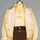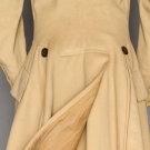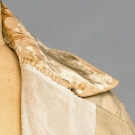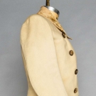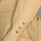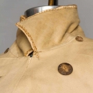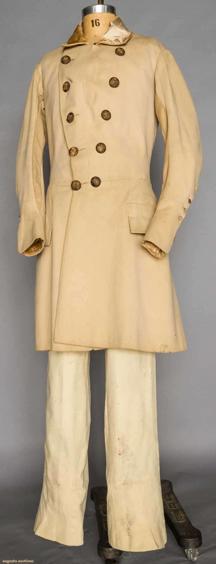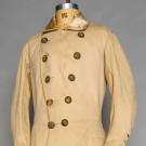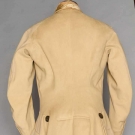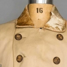 Beige wool broadcloth, fitted through chest, tan velvet collar & turn back cuffs, diagonal double row of brown thread buttons, side & F waist seam, double pleats to wide back skirt, CH 40", L 39", (1 tiny hole, velvet knap worn & torn, sleeves enlarged w/ inset beige wool gusset) very good. James Kochan - Don Troiani Collections