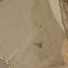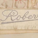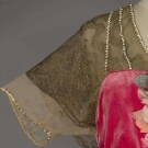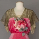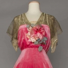 Silk velvet, upper bodice of gold lace over chiffon trimmed w/ rhinestone bands, silk blossom corsage, trained skirt narrows to ankles, label "Robert, Paris", B 32"-34", W 24", L 52"-76", (hem edge dirty, chiffon w/ stains & holes) very good.