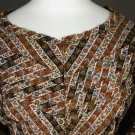 Roller printed in stripes of orange, brown and white over-printed with red and blue florals, rounded neckline, center front closure, bodice with tucked bias diagonal bands across chest, full puffed sleeve tapering to 1" piped cuff, self fabric button oneach cuff, apron front gathered to drawstring tie, finished with attached 2" fabric belt, full gathered skirt, muslin lined bodice, sleeves and hem facing, probably English, excellent.