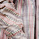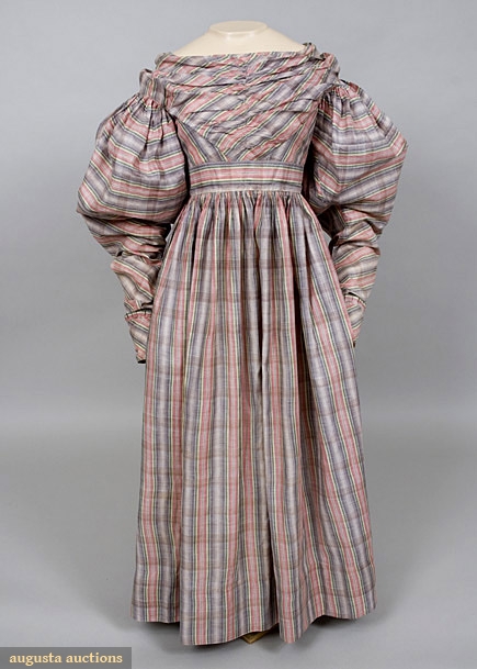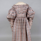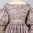 Linen woven in white, green, rose, yellow, and purple, wide V neckline with diagonal gathers across chest, puffed long sleeves ending in piped and box pleated 3" cuff, inset waistband, full gathered skirt, back closure with steel hooks & eyes, musli n bodice lining, (scattered pin holes, few faint stains, hooks & eyes modern) excellent.